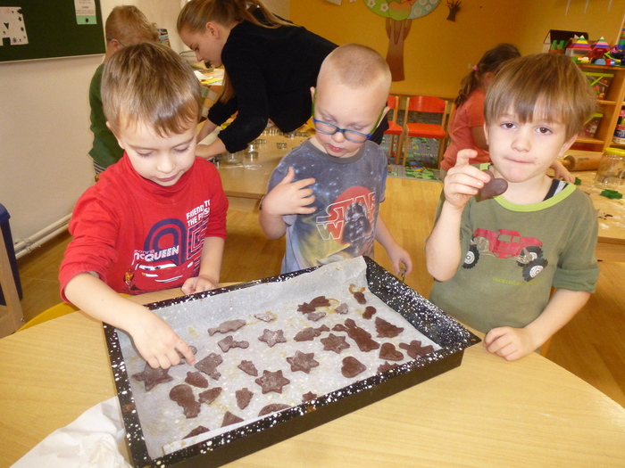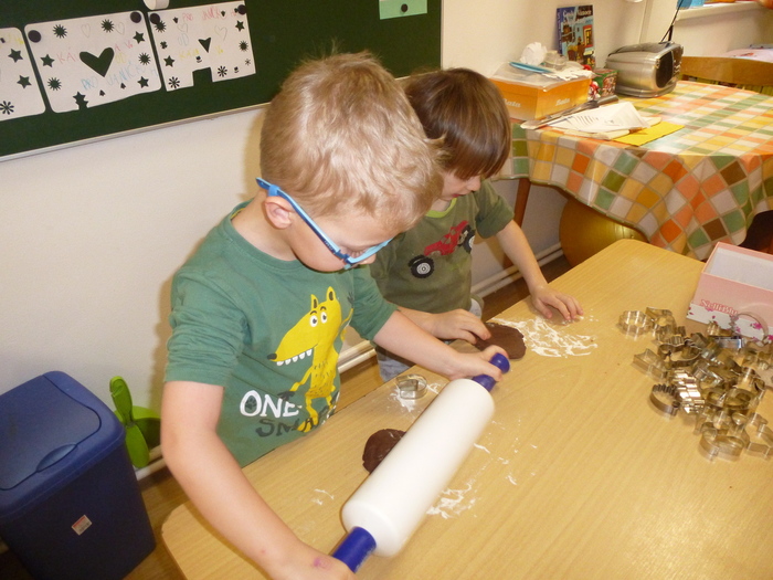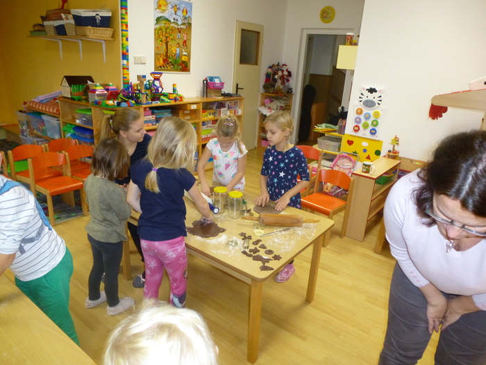 Na čtvrtek 28.11. bylo pro děti naplánováno pečení perníčků. Děti byly rozděleny na dvě skupinky a vykrajovaly a vykrajovaly..... andílky, houbičky, rybičky, srdíčka a další vánoční vykrajovátka. Pak objevily razítka na těsto. Orazítkovaly téměř všechny vykrájené perníčky. Byla to velká zábava- Ne už tak pro paní kuchařku, která to všechno musela ohlídat u trouby a paní školnice pak uklidit mouku, která byla všude. Ještě že ty Janičky máme!